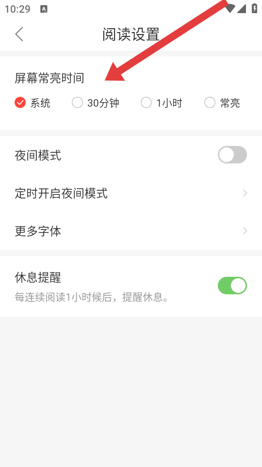 3、在閱讀設(shè)置的頁面,可以根據(jù)需求進(jìn)行多種閱讀模式設(shè)置,比如調(diào)節(jié)屏幕常亮?xí)r間。