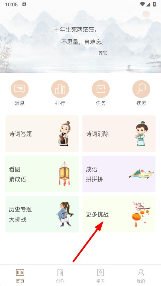 1、打開詩詞天地app,在首頁點(diǎn)擊更多挑戰(zhàn)選項(xiàng)。