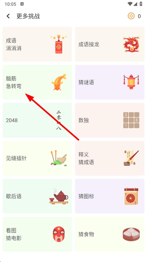 2、在更多挑戰(zhàn)頁面中,找到并點(diǎn)擊腦筋急轉(zhuǎn)彎選項(xiàng)。