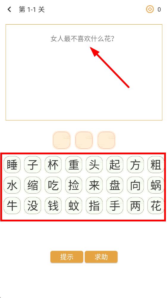 4、在關(guān)卡界面,閱讀題目內(nèi)容,然后從下方字板中點(diǎn)擊選擇合適的漢字組成答案來完成答題。