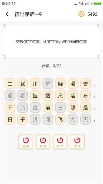 《詩詞中華》是一款集學(xué)習(xí),娛樂,益智于一身的寓教于樂軟件,用于幫助用戶學(xué)習(xí)并強(qiáng)化詩詞。軟件由淺入深進(jìn)行學(xué)習(xí),每一首詩詞。用戶只需要點(diǎn)擊詩詞中的漢字來調(diào)整順序,將詩句補(bǔ)充完整即可過關(guān)。如果實(shí)在不知道怎么消除了,可以點(diǎn)擊提示來獲得一些幫助喲。