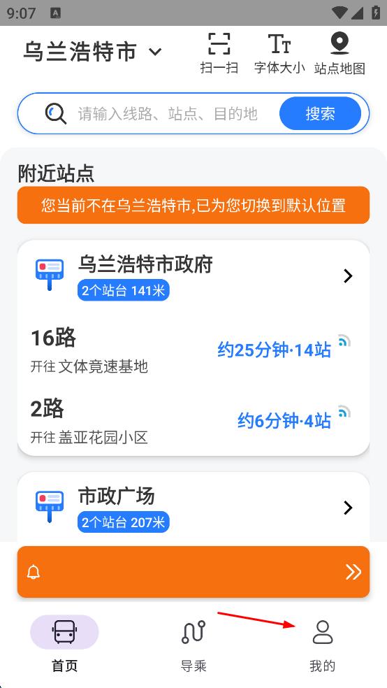 1、打開公交查詢軟件,進入首頁后,點擊頁面底部右側(cè)的“我的”選項,進入個人中心頁面。