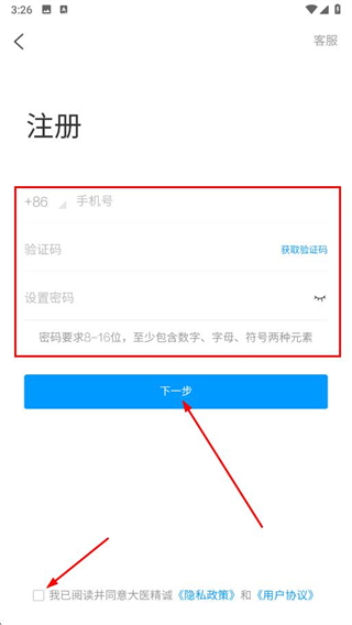 4、輸入手機(jī)號(hào)、驗(yàn)證碼,設(shè)置密碼,勾選用戶協(xié)議,點(diǎn)擊下一步按鈕。