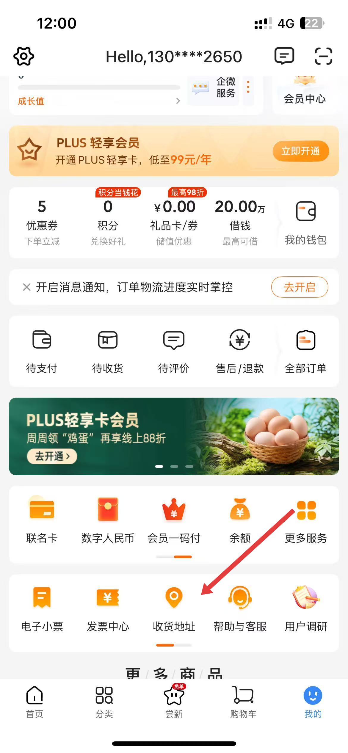 2、進入我的頁面后,下滑找到收貨地址選項,點擊該選項,即可進入收貨地址管理界面。