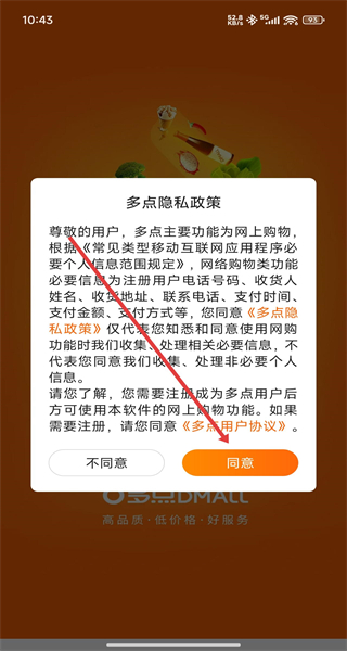1、點擊“多點隱私政策”彈窗的“同意”,進入多點APP首頁。