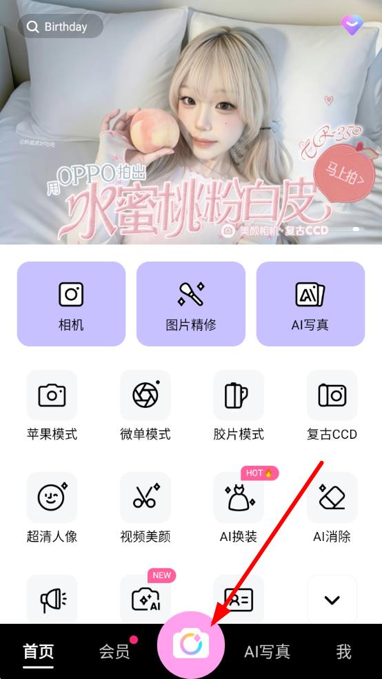 1、打開(kāi)美顏相機(jī)APP,點(diǎn)擊底部中間的拍攝按鈕進(jìn)入拍攝界面,準(zhǔn)備開(kāi)始拍攝設(shè)置。