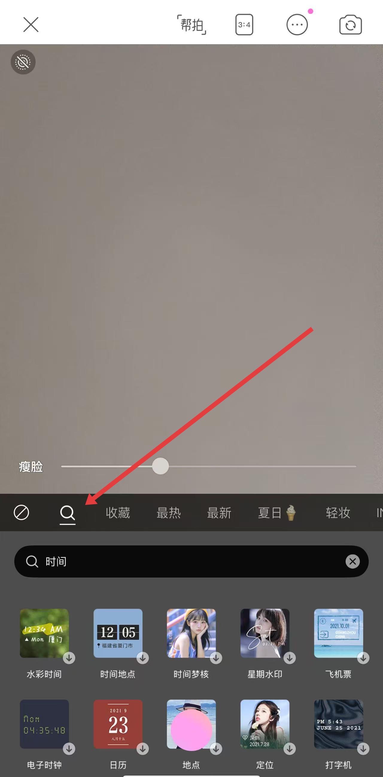 3、在貼紙菜單中,點(diǎn)擊搜索圖標(biāo),輸入時(shí)間進(jìn)行搜索,就能找到各類帶有時(shí)間的貼紙,選擇喜歡的添加到拍攝畫面中。