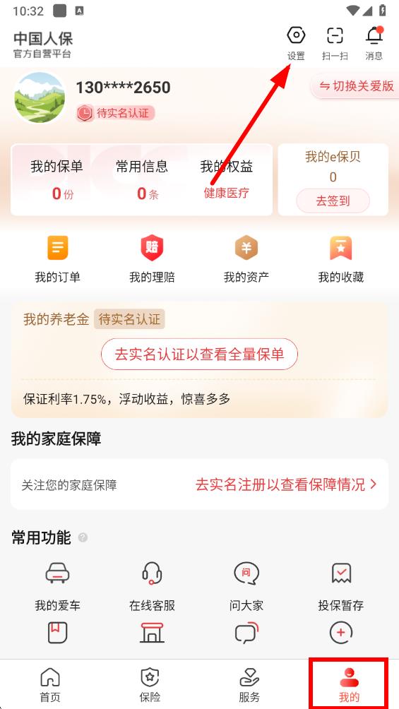 1、打開中國人保app,點擊進(jìn)入底部右下角我的選項,在右上角點擊設(shè)置圖標(biāo),進(jìn)入設(shè)置頁面。