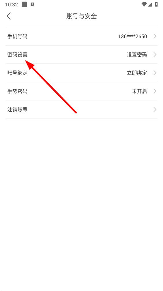 4、在賬號與安全界面中,點擊密碼設(shè)置,進(jìn)入密碼設(shè)置界面。