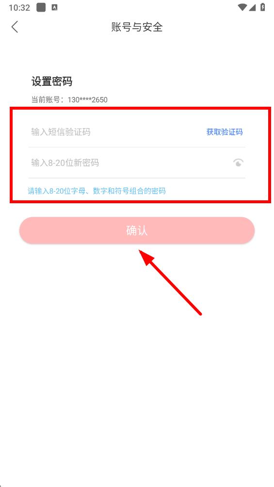 5、在界面輸入框內(nèi)輸入短信驗證碼,再設(shè)置新密碼,完成后點擊確認(rèn),即可成功設(shè)置密碼。