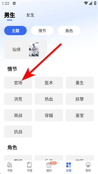 1、在免費趣小說分類頁面,點擊官場分類,進(jìn)入官場小說列表。
