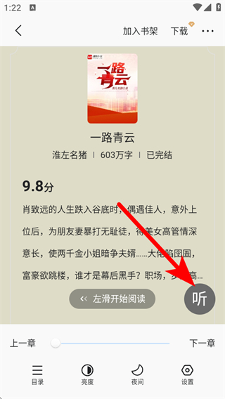 3、在小說詳情界面,點擊聽按鈕,進(jìn)入聽書界面。