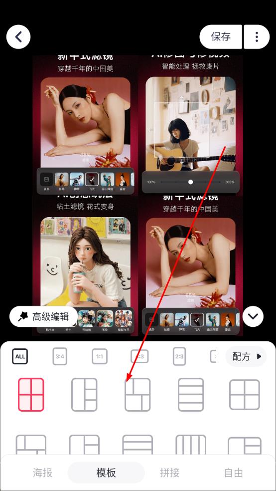 3、進入拼圖編輯頁,切換到模板tab,選擇喜歡的拼圖模板樣式,完成后點擊保存,導(dǎo)出拼圖作品。