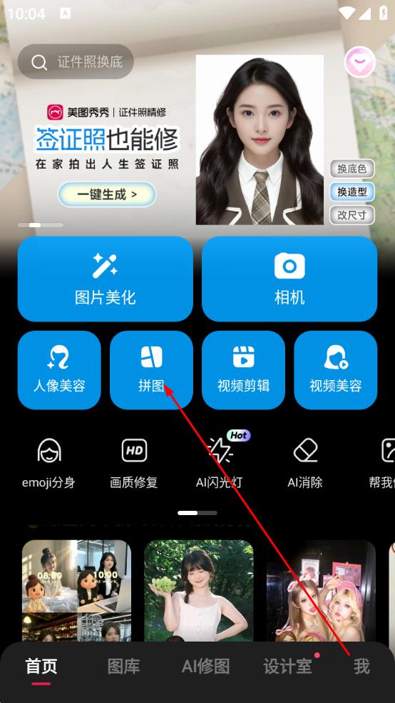1、打開美圖秀秀APP,在首頁點擊拼圖功能按鈕,進入圖片選擇界面。