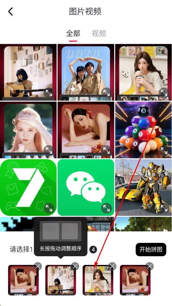 2、在圖片視頻頁,勾選要拼圖的圖片可長按拖動調(diào)整順序 ,選好后點擊開始拼圖。