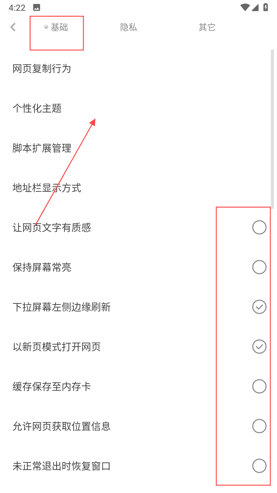 1、進入設置中的基礎(chǔ)設置界面,能看到網(wǎng)頁復制行為、個性化主題等選項,勾選下拉屏幕左側(cè)邊緣刷新,以新頁模式打開網(wǎng)頁等選項,可按個人偏好調(diào)整網(wǎng)頁瀏覽的基礎(chǔ)交互。