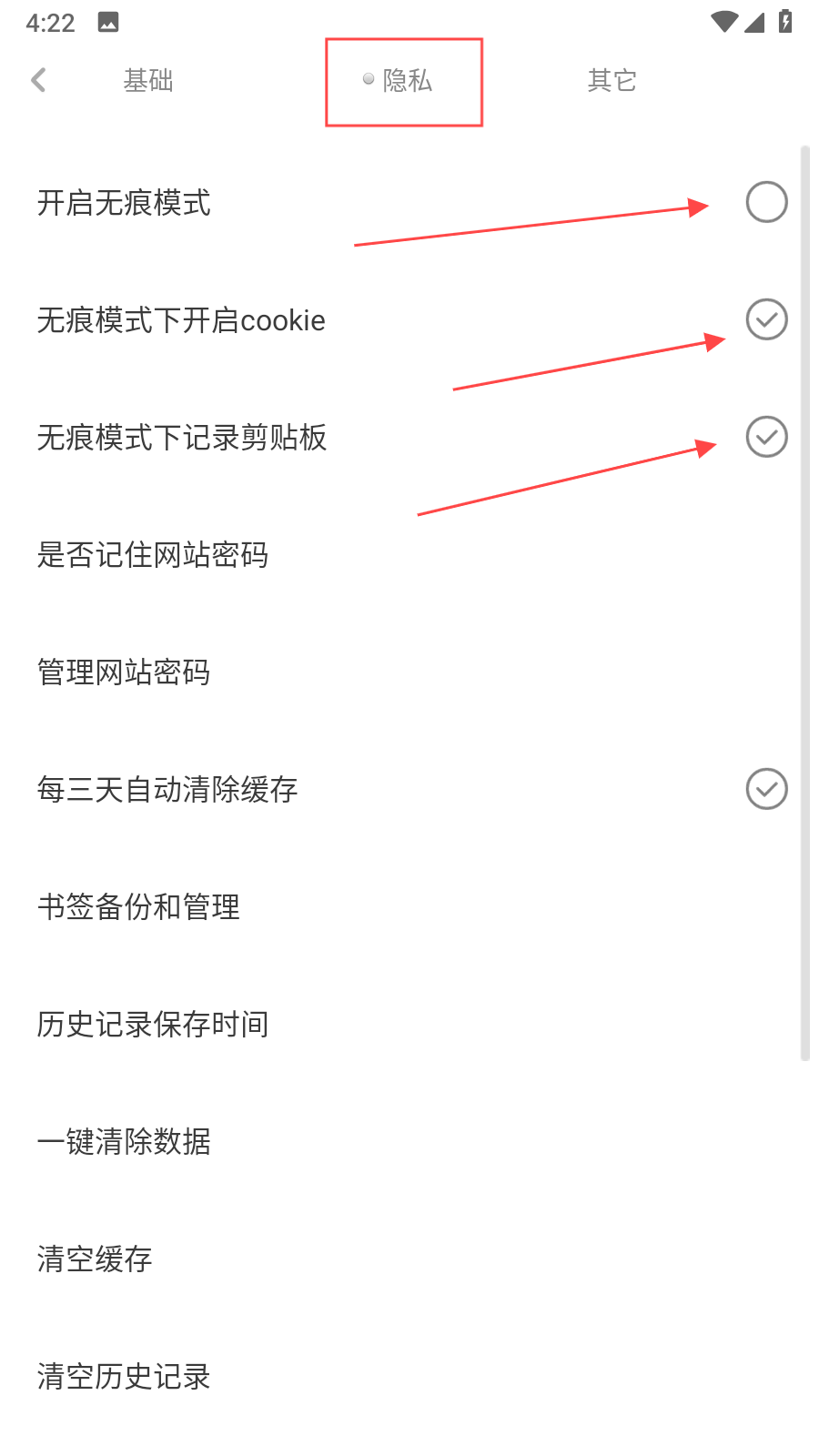 2、切換到隱私設置界面,可對隱私相關(guān)選項進行操作,若想保護瀏覽隱私可勾選開啟無痕模式,還能設置無痕模式下是否開啟cookie、是否記錄剪貼板,以及管理網(wǎng)站密碼等。