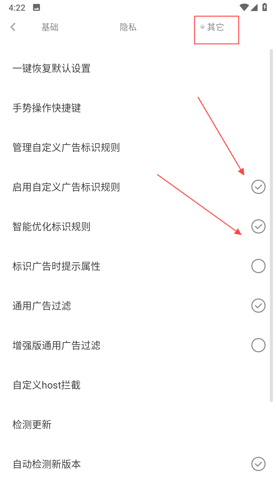 3、在其它設置界面,可進行一鍵恢復默認設置、管理手勢操作快捷鍵等操作,勾選啟用自定義廣告標識規(guī)則,智能優(yōu)化標識規(guī)則,通用廣告過濾等選項,能有效過濾廣告。