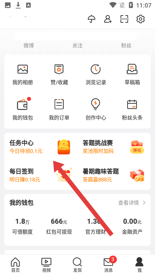1、打開微博APP后進(jìn)入我的頁(yè)面,點(diǎn)擊任務(wù)中心今日待領(lǐng)圖標(biāo),進(jìn)入任務(wù)中心。