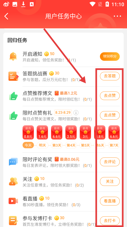2、在用戶任務(wù)中心里,點(diǎn)擊任務(wù)右側(cè)按鈕完成答題、點(diǎn)贊等任務(wù),可領(lǐng)取積分或紅包。