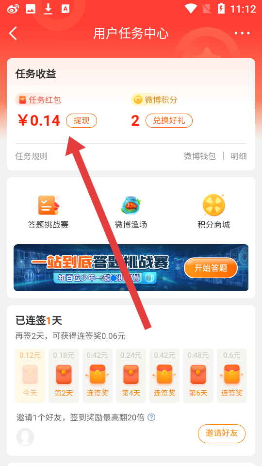 3、完成一定任務(wù),積累紅包金額,在任務(wù)中心的任務(wù)收益處點(diǎn)擊提現(xiàn)即可賺錢。