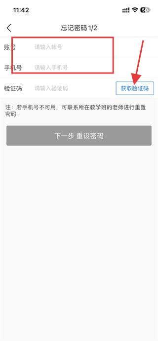 2、在忘記密碼頁面中,填寫賬號和手機(jī)號,點擊獲取驗證碼。
