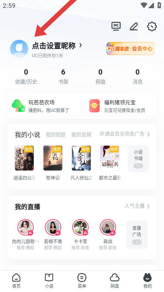 1、打開UC瀏覽器APP,進(jìn)入我的頁面后,點(diǎn)擊左上角頭像或點(diǎn)擊設(shè)置昵稱區(qū)域,進(jìn)入個(gè)人信息界面。