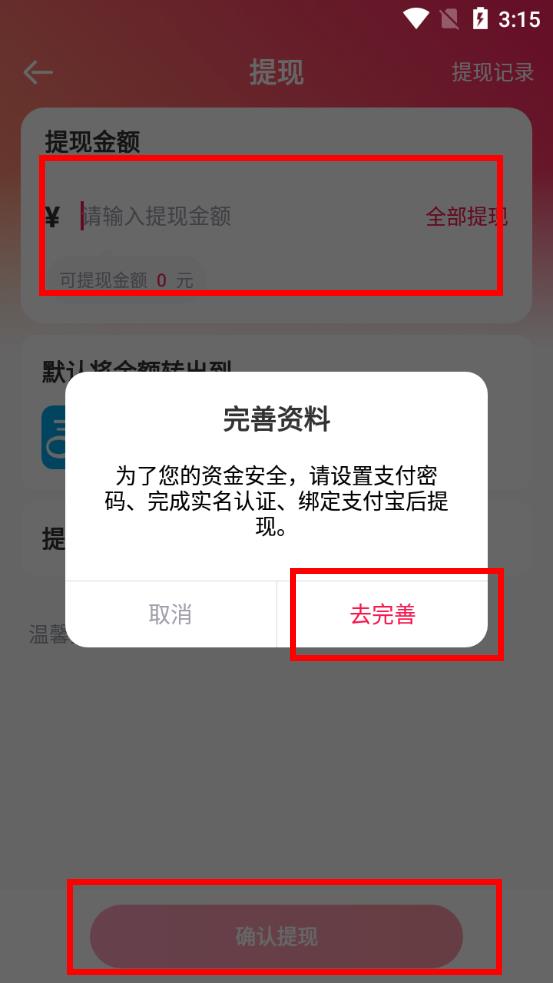 4、在提現(xiàn)頁(yè)面輸入提現(xiàn)金額,若未完善資料,會(huì)彈出提示,點(diǎn)擊去完善,再返回輸入金額并點(diǎn)擊確認(rèn)提現(xiàn)。