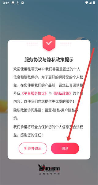 1、打開(kāi)租號(hào)玩APP,彈出服務(wù)協(xié)議與隱私政策提示窗口,點(diǎn)擊同意按鈕進(jìn)入。