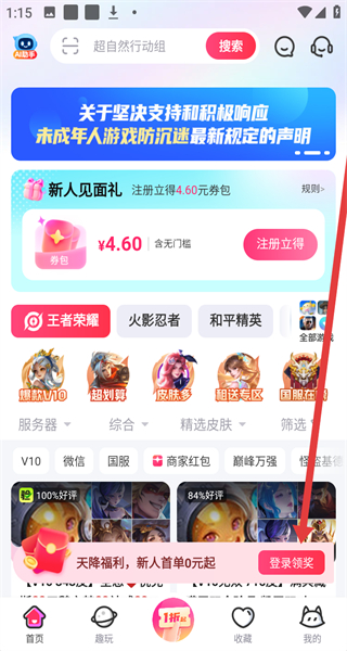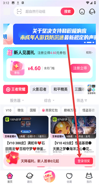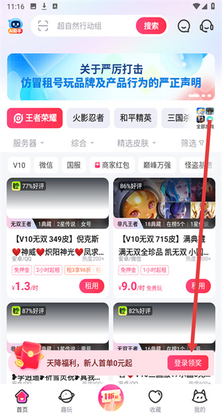 1、在租號(hào)玩首頁(yè)中,可以點(diǎn)擊下方登錄領(lǐng)獎(jiǎng)按鈕,跳轉(zhuǎn)頁(yè)面進(jìn)行登錄操作。