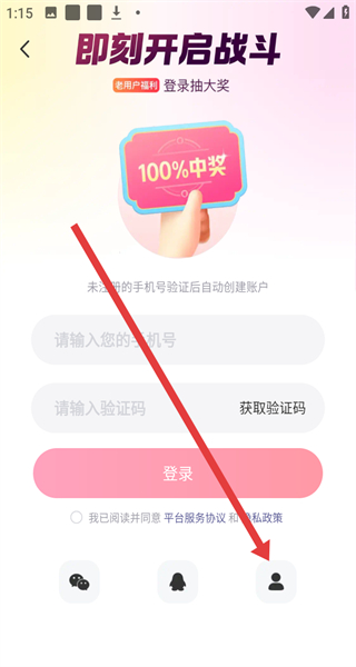2、在跳轉(zhuǎn)至手機(jī)驗(yàn)證碼登錄頁(yè)面后,可以點(diǎn)擊下方賬號(hào)圖標(biāo),切換使用賬號(hào)密碼進(jìn)行登錄操作。