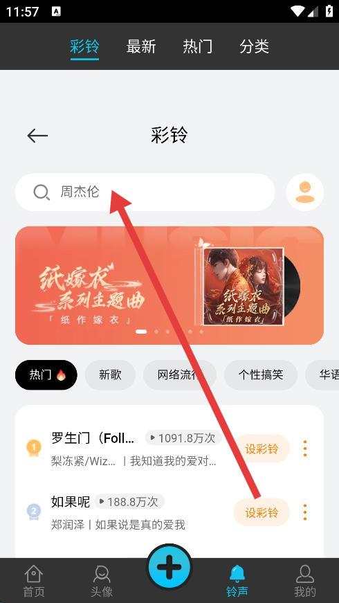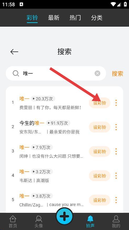4、在搜索結(jié)果中找到你想設(shè)置的鈴聲,點擊其右側(cè)的設(shè)彩鈴按鈕。