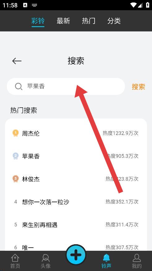 2、在鈴聲頁面上方的搜索欄中,輸入你想要設(shè)置為鈴聲的歌曲關(guān)鍵詞。