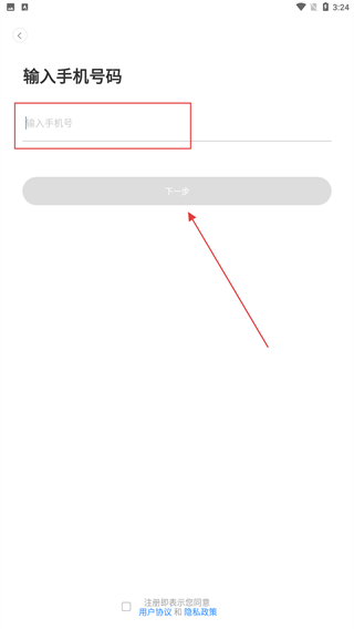2、進(jìn)入注冊的頁面內(nèi),輸入手機(jī)號再點(diǎn)擊下一步。