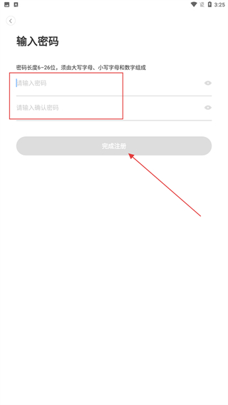 4、進(jìn)入最后一步,輸入密碼后點(diǎn)擊完成注冊即可。