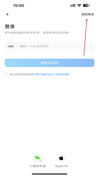 3、進入登錄的界面內(nèi),點擊右上方密碼登錄的按鈕。