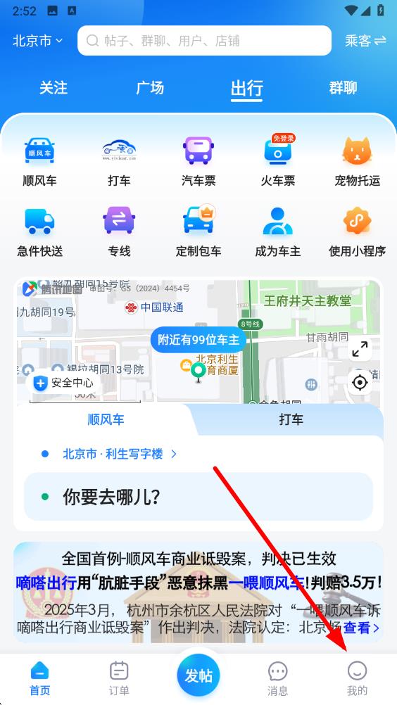 1、打開一喂順風(fēng)車app,進(jìn)入主界面,點(diǎn)擊底部導(dǎo)航欄最右側(cè)我的圖標(biāo),進(jìn)入個人相關(guān)界面。