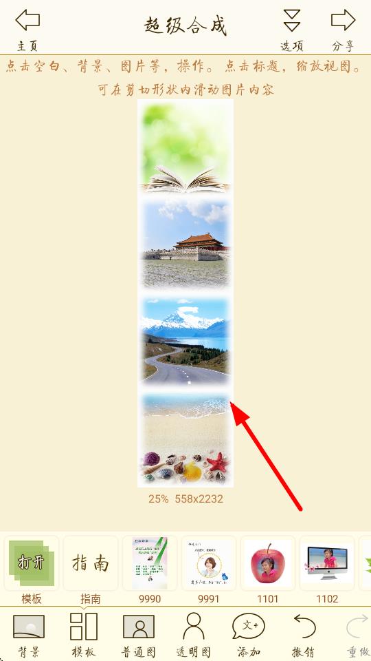 4、選好模板后,在超級合成頁按提示滑動圖片內(nèi)容調整效果。