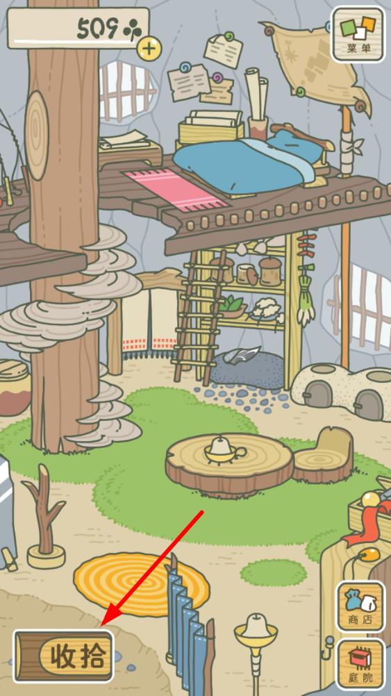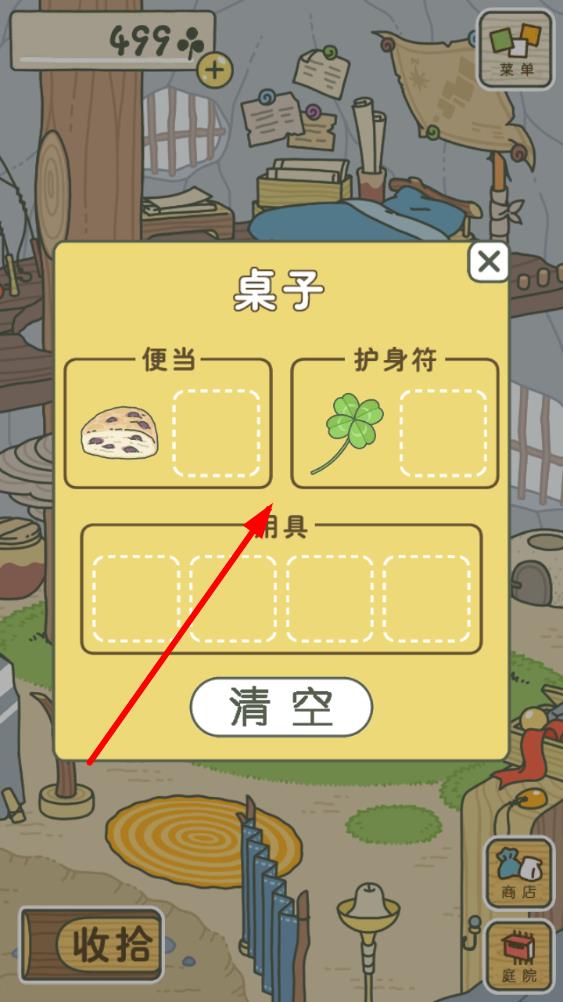 1、點(diǎn)擊界面左下角收拾按鈕,可對(duì)青蛙的出行物品進(jìn)行整理,三葉草是游戲貨幣,可用來(lái)在商店購(gòu)買相關(guān)物品,為青蛙的出行做好準(zhǔn)備。
