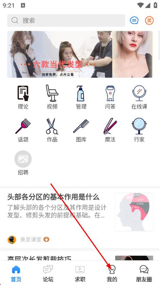 1、打開美發(fā)課堂app,點擊底部導航欄的我的選項。