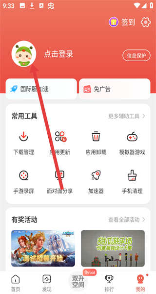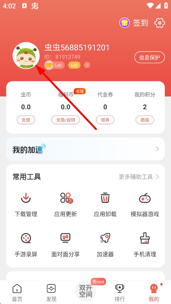 1、打開蟲蟲助手APP,點擊底部導(dǎo)航欄中的我的,進入個人頁面,點擊左上角的頭像區(qū)域。