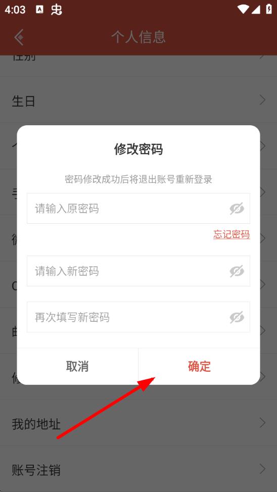 3、在修改密碼界面,依次輸入原密碼、新密碼、再次填寫新密碼,確認(rèn)信息無誤后,點擊確定按鈕,即可完成密碼修改,修改成功后將退出賬號,需重新登錄。