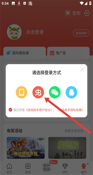 1、打開蟲蟲助手APP,進入我的頁面,通過點擊登錄,彈出請選擇登錄方式窗口。