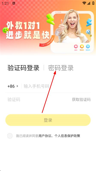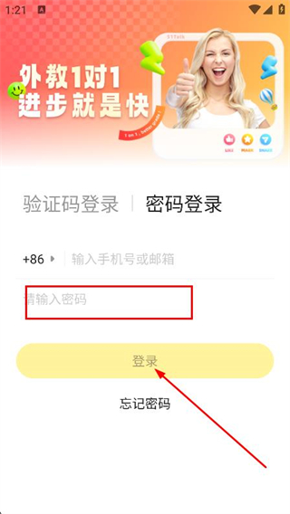 1、打開51Talk無憂英語,在登錄頁面點擊密碼登錄。