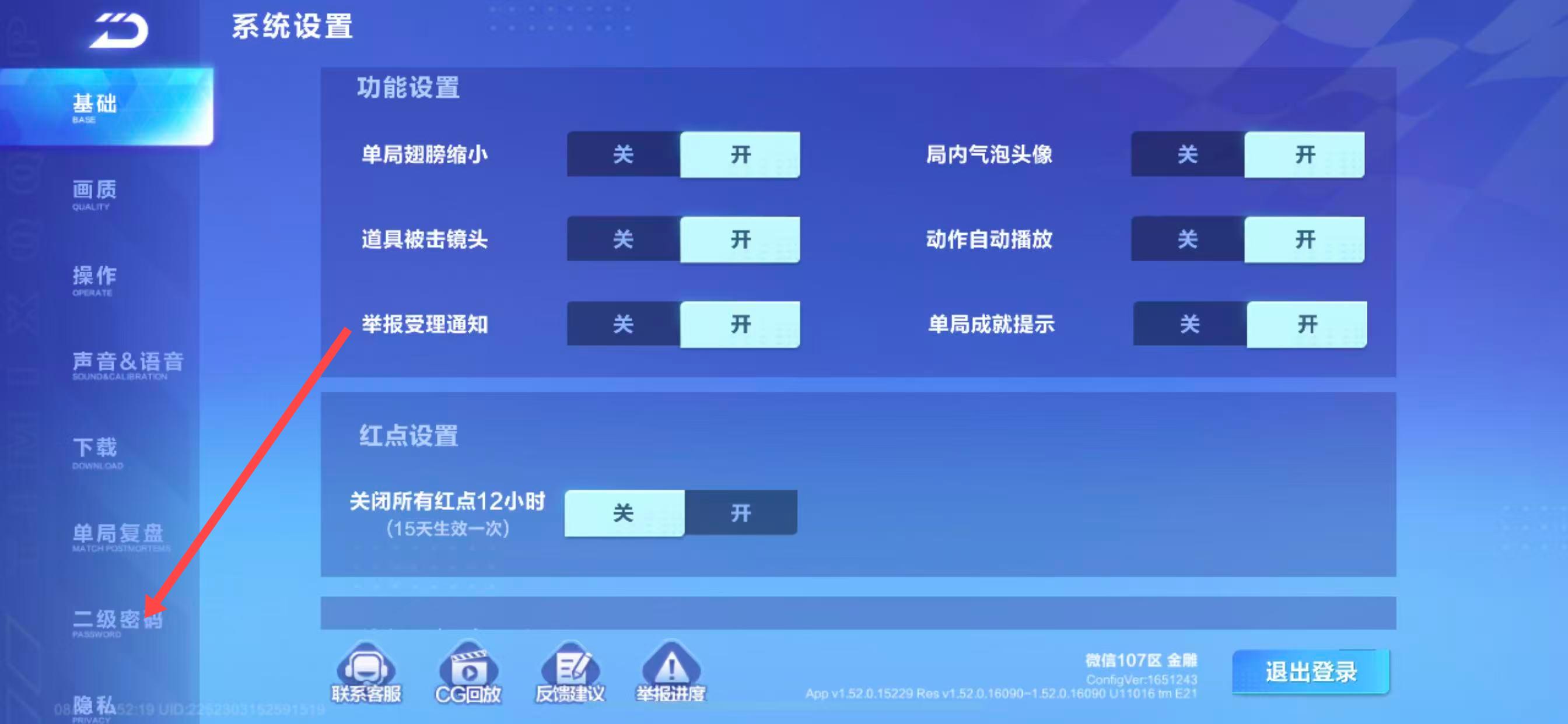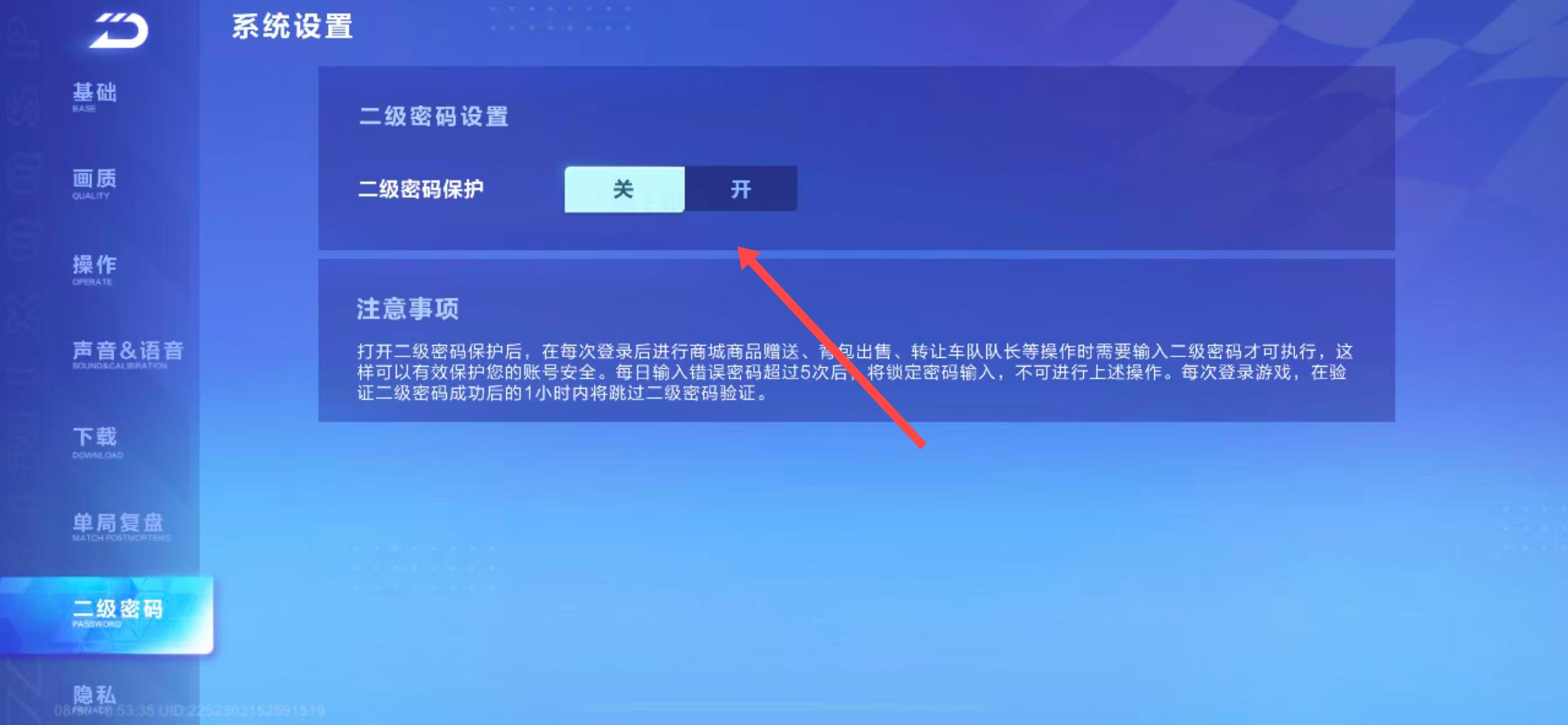 3、在“二級(jí)密碼設(shè)置”板塊,點(diǎn)擊二級(jí)密碼保護(hù)的開(kāi)關(guān),將其設(shè)置為開(kāi)。