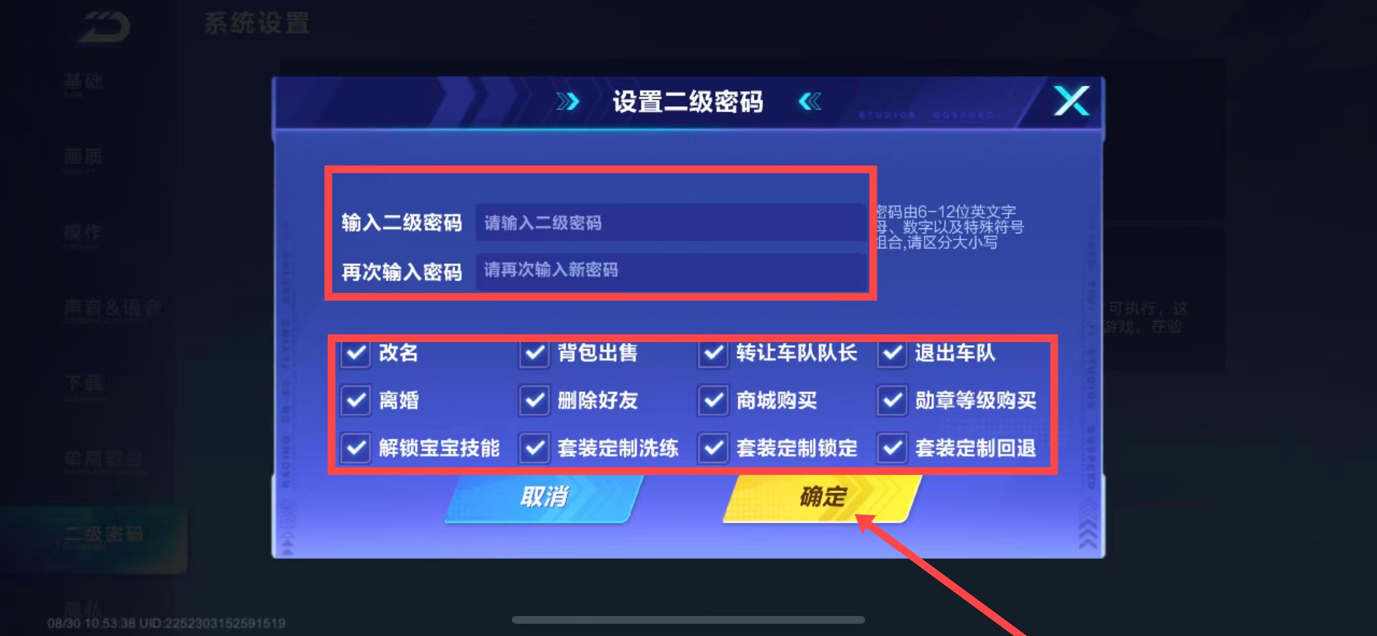 4、輸入二級(jí)密碼,再次輸入密碼確認(rèn),并勾選需要二級(jí)密碼保護(hù)的操作項(xiàng)目,點(diǎn)擊確定完成設(shè)置。