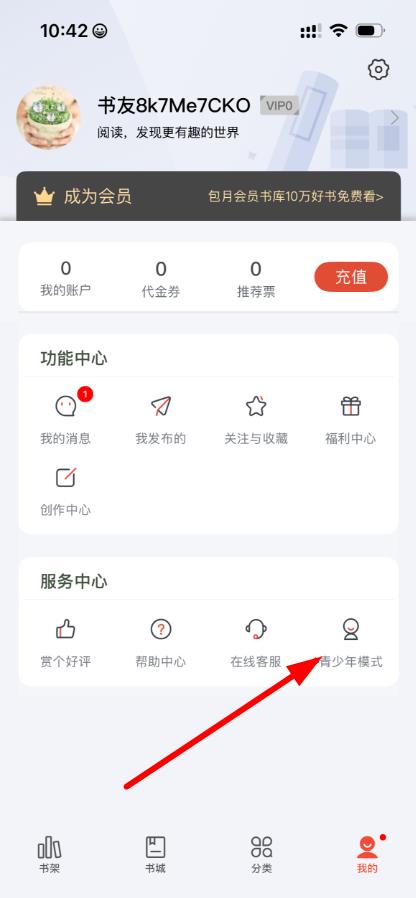 2、在個(gè)人中心頁(yè)面的服務(wù)中心板塊里,點(diǎn)擊青少年模式選項(xiàng),進(jìn)入青少年模式設(shè)置界面。