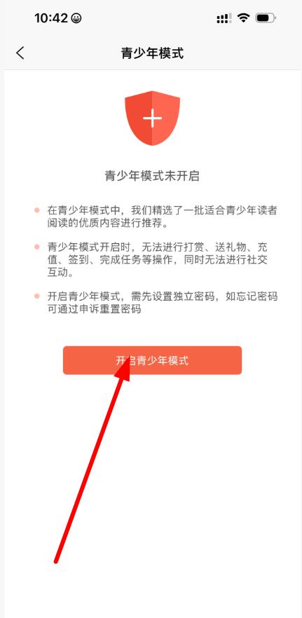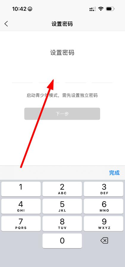 3、在青少年模式設(shè)置界面,點(diǎn)擊開(kāi)啟青少年模式按鈕,接著在彈出的設(shè)置密碼界面中,設(shè)置獨(dú)立密碼,按照提示完成操作后,即可成功開(kāi)啟青少年模式。