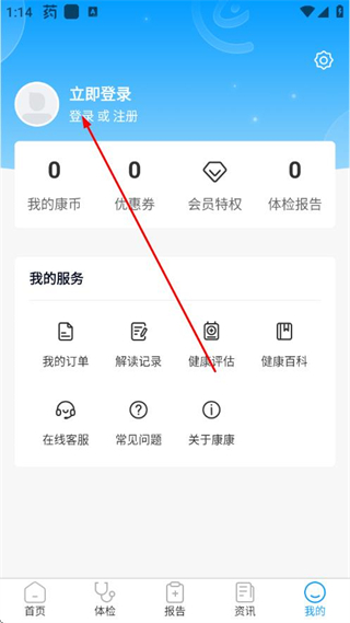 1、打開(kāi)康康在線App的首頁(yè),點(diǎn)擊底部的我的選項(xiàng),進(jìn)入個(gè)人中心頁(yè)面。