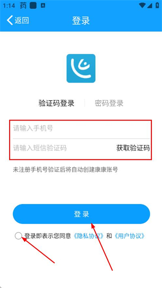3、在登錄頁(yè)面輸入手機(jī)號(hào)、獲取并填寫驗(yàn)證碼,勾選同意協(xié)議后點(diǎn)擊登錄。